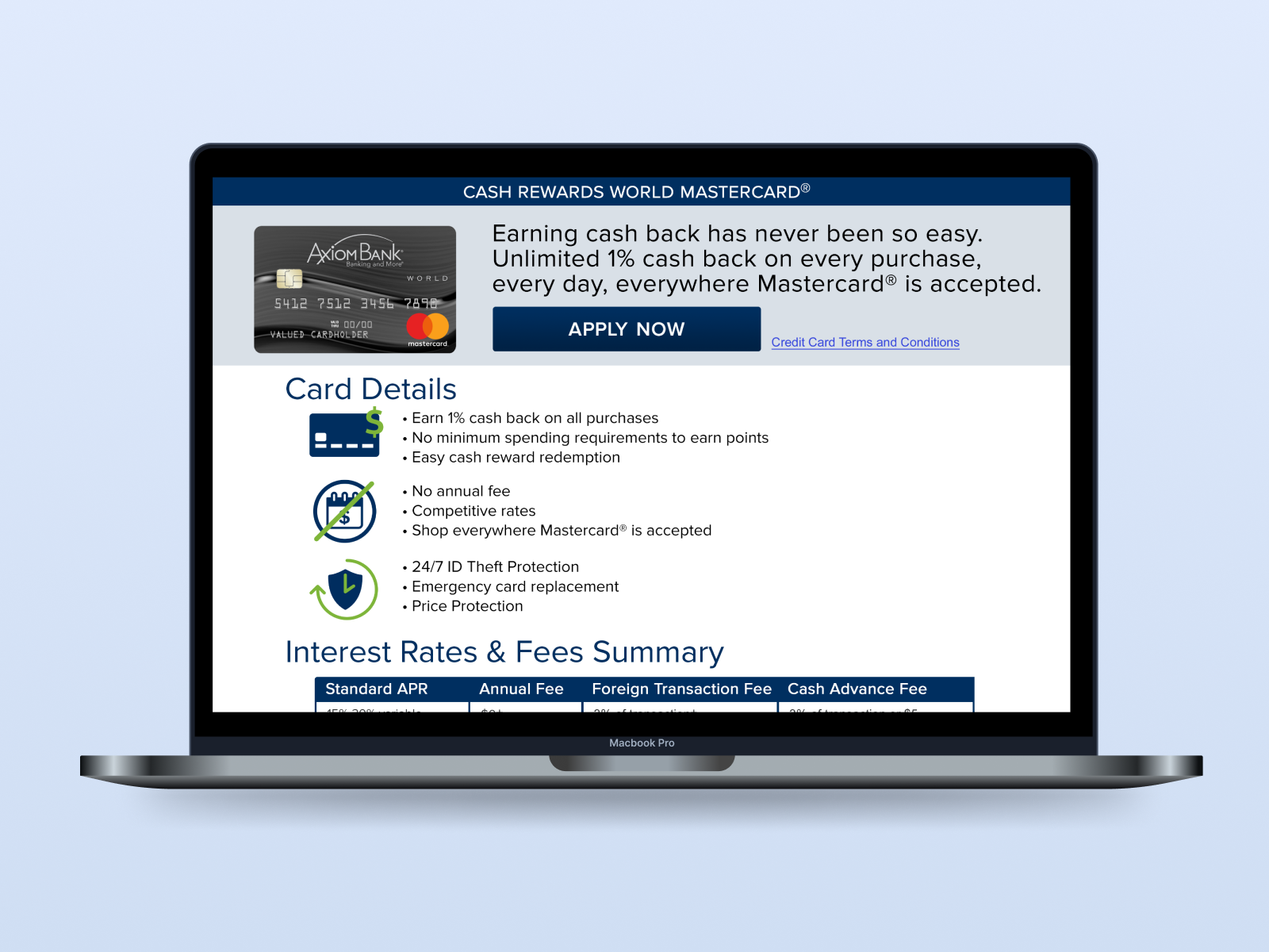 Axiom's goal was to not only minimize the amount of time it took a potential customer to find the application, but to minimize the amount of time filling in information. I accomplished the first task by consolidating/streamlining the amount of pages in the pre-application workflow. The second task required much more user testing and competitor research to determine which stages of the application were the most problematic or confusing. This led to significant improvements in the UX and increased onboarding.